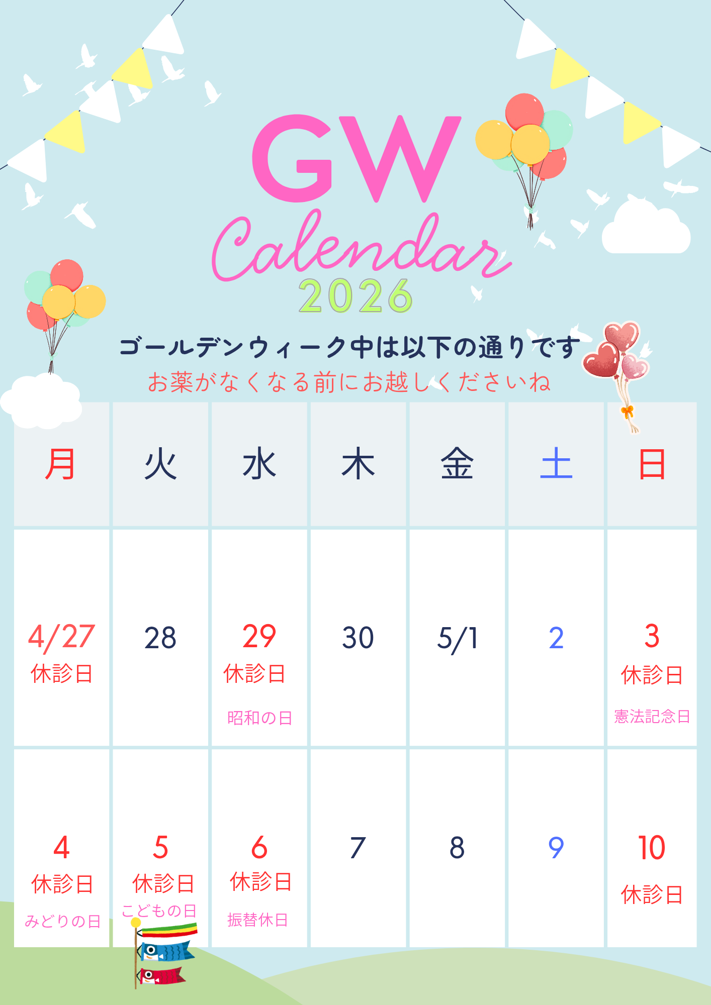 GWの診療のお知らせ:日曜・月曜・祝日がお休みです